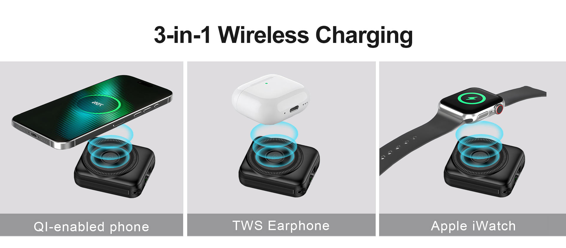 ◆ 3-in-1 Wireless Charging QI-enabled phone/Apple iWatch/TWS earphone